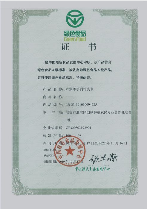 经中国绿色食品发展中心审核,由淮安市淮安区创联种植农民专业合作社联合社生产的“卢家滩手剥鸡头米”达到绿色食品质量标准,被认定为A级“绿色食品”,产品编号:LB-23-19101009478A--这也是联合社第三个获此殊荣的产品。